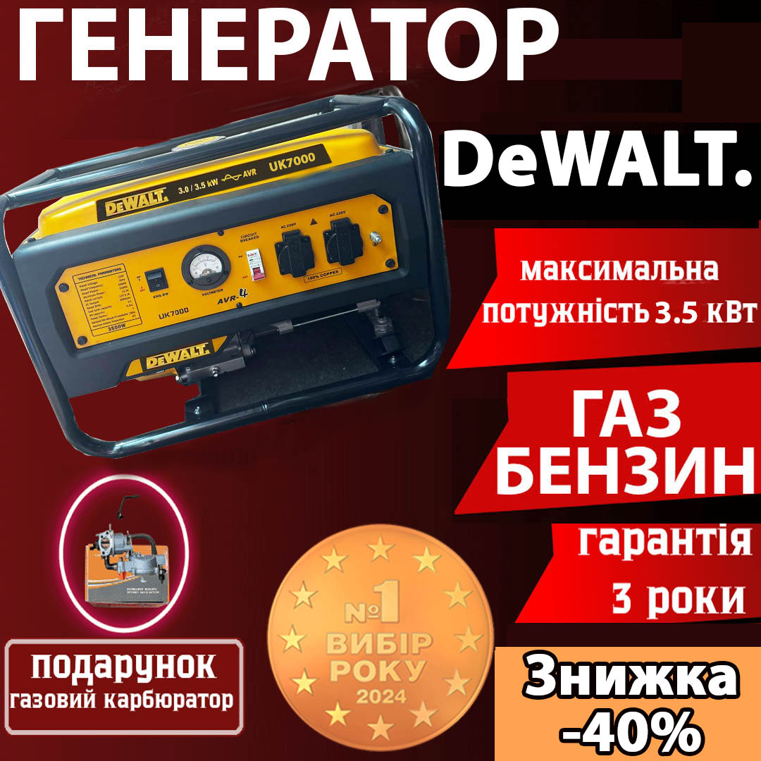 Купив генератор UK7000 DeWalt для дачі, і це було одне з найкращих рішень! Під час частих відключень електроенергії він завжди нас виручає. Легко запускається і працює безперебійно. Дуже задоволений!